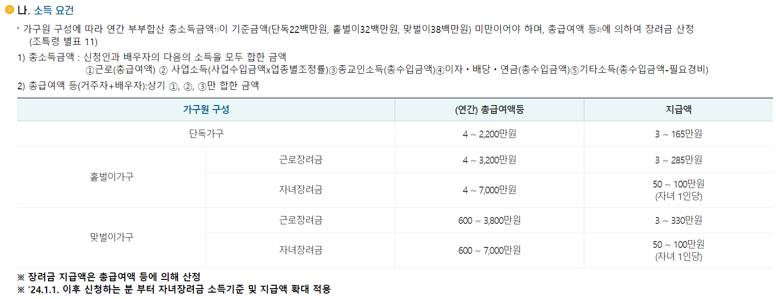 전년도 부부합산 연간 총소득이 가구 유형에 따라 정한 총 소득기준금액 미만이어야 함.